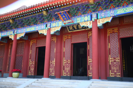 東宮門門楣檐下全部用油彩描繪著絢麗的圖案,六扇朱紅色大門上嵌著整齊的黃色門釘,中間檐下掛著九龍金字大匾,上書“頤和園”三個大字,為光緒皇帝御筆親題。門前御道丹陛上的云龍石雕刻著二龍戲珠,為乾隆年代所刻,是從圓明園廢墟(安佑宮)上移來的,它是皇帝尊嚴(yán)的象征。東宮門當(dāng)年只供清朝帝后出入。