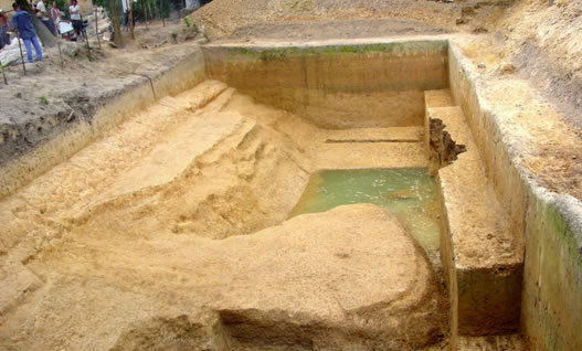 草鞋村遺址位于北海市合浦縣廉州鎮(zhèn)草鞋村,西臨南流江分支—廉州西門江。發(fā)現(xiàn)陶窯、磚窯共22座,建筑遺址5處,水井5口及一批作坊遺跡,呈環(huán)狀分布于遺址臺(tái)地的坡坎四周,初步判定為漢代嶺南地區(qū)重要的官營手工業(yè)作坊。