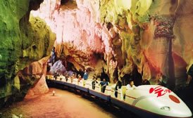 冠巖位于桂林市南29公里處,漓江東岸的草坪鄉(xiāng),因山形如帝王的紫金冠而得名。冠巖是一個(gè)巨型地下河溶洞,全長(zhǎng)12公里,發(fā)源于桂林東面的海洋山。冠巖1995年正式對(duì)外開放,群峰競(jìng)秀,碧水傳情,洞奇石美。 夜幕降臨,還有美妙的民族歌舞晚會(huì),熱情的山歌響徹峽谷。
