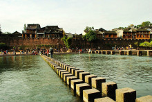沱江跳巖古城人氣旺盛的風(fēng)景之一。這是一座古道橋梁,最早建于唐代,是乾州進(jìn)入當(dāng)時(shí)的五寨司城的必經(jīng)之路。清康熙四十三年(1704年)重修,仍是鳳凰至乾城的古道。跳巖最初由四十多個(gè)紅色長(zhǎng)方體巖墩子組成,每墩相距二尺,便于鄉(xiāng)民肩挑背馱入城,但每年漲洪水時(shí)總有跳巖石墩被沖倒或沖走。民國(guó)時(shí)期,縣長(zhǎng)李宗祺讓在跳巖上架以木板,這比以前行走更為方便,但仍連墩帶跳板被沖走。1950年,鳳凰縣人民政府成立,又重新補(bǔ)缺換新將石墩加大,將兩個(gè)墩子聯(lián)成一個(gè),跳巖全長(zhǎng)100米,共15個(gè)巖墩,上鋪厚實(shí)的木板,并以鐵鏈在河底從巖上打眼,用鐵絲系緊,跳巖堅(jiān)固牢實(shí),保存完好,如今不僅仍是兩岸人民來往的要道,而且成為鳳凰古城頗具民族特色的亮麗風(fēng)景。2000年秋,為了進(jìn)一步改善群眾過河的條件,也為了更好地美化裝點(diǎn)古城,鳳凰縣撥款在老跳巖幾十米距離的河下游,新修了一道雙墩跳巖,兩排跳巖相隔一尺左右,一高一低,并排而立,橫跨江上,每排跳巖66墩,一字列于江面,每個(gè)石墩之間的距離也就一小步左右,來的走一排,去的走另一排。