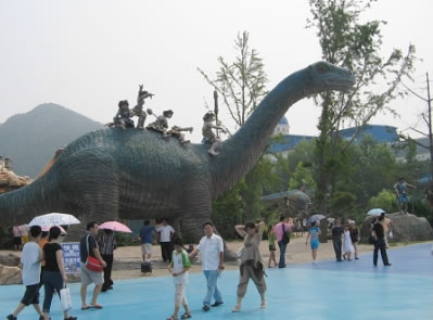 侏羅紀激流探險,總占地面積8600平方米,以一種時空穿插的景觀設(shè)計手法,將五種八只侏羅紀時期的恐龍置身于虛幻的遠古村落中。載客古船,沿210米長,15米高的水道激流急下,沿途中,一只高9米,長19.8米,重約8噸的亞洲最大的機械恐龍“巨無霸”,不時的向沖刺在激流中的游人搖頭擺尾,吼叫或噴水,載客古船激起的25米高的巨浪。 旅游船