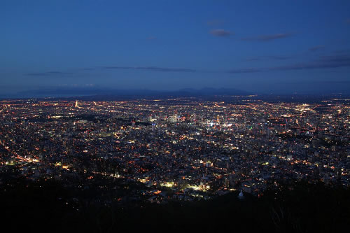 札幌自2015年被選為“日本新三大夜景”之一。這座城市的夜幕降臨之后,約200萬(wàn)人生活的璀璨燈火,與渺無(wú)人煙的靜謐山林,勾勒出清晰的明暗交界,十分美麗。而冬季有北海道特有的清冷空氣,與全城積雪帶來(lái)的統(tǒng)一色調(diào)與柔和反光加成,更使冬季的札幌夜景別具一格。