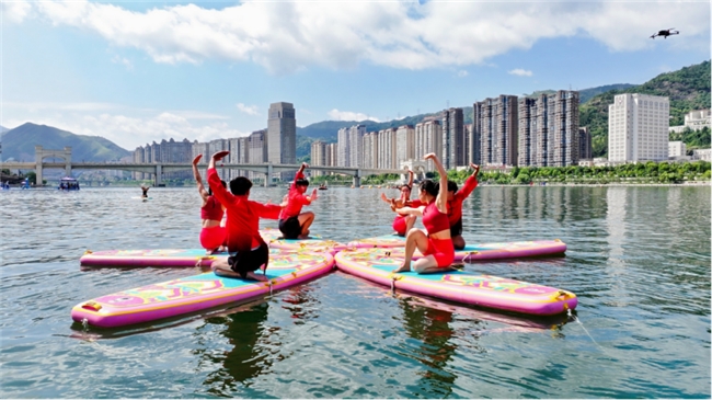 青田地處浙江省東南部,甌江中下游,山水資源豐富,水域總面積超100平方公里,水資源常規(guī)指標(biāo)遠(yuǎn)遠(yuǎn)優(yōu)于全國(guó)、全省平均水平,環(huán)湖綠帶鑲嵌著豐富的歷史人文景點(diǎn),湖岸城市風(fēng)光與大自然風(fēng)光融為一體,槳板與瑜伽擦出水上火花。