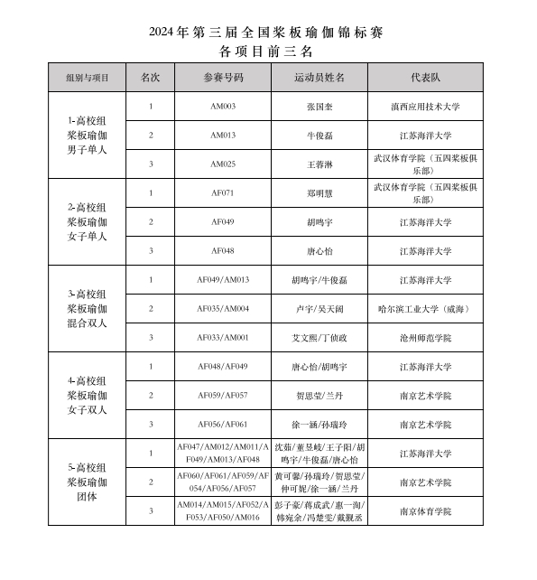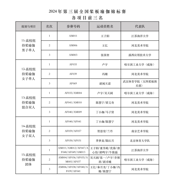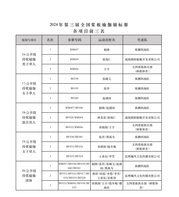 最終經(jīng)過(guò)為期兩天的激烈競(jìng)賽,“意爾康杯”2024年第三屆全國(guó)槳板瑜伽錦標(biāo)賽共決出槳板瑜伽、持槳瑜伽、槳板體適能等3大類(lèi)共22項(xiàng)比賽各項(xiàng)前三名的獲獎(jiǎng)名次。
