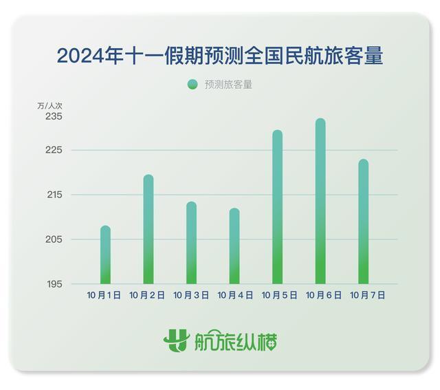 今年國(guó)慶旺季民航繼續(xù)呈“量升價(jià)跌”趨勢(shì)。據(jù)民航出行服務(wù)平臺(tái)“航旅縱橫”近日發(fā)布的報(bào)告顯示,2024年國(guó)慶假期期間(10月1日至10月7日)全國(guó)民航旅客量預(yù)計(jì)將超1565萬人次,日均旅客運(yùn)輸量達(dá)223萬人次,同比2023年國(guó)慶假期增長(zhǎng)7%,較2019年同期增長(zhǎng)19%。