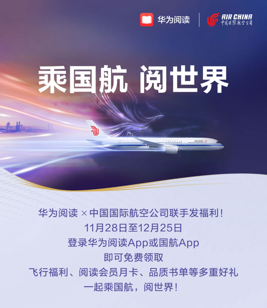 為了豐富旅客的飛行時光,近日華為閱讀與中國國際航空公司攜手,正式啟動了“乘國航 閱世界”國航伴讀計(jì)劃,該計(jì)劃通過整合華為閱讀的豐富資源與國航的全球航線網(wǎng)絡(luò),為用戶打造一個旅行中的高品質(zhì)閱讀空間。參與此次活動的用戶將可免費(fèi)領(lǐng)取3重好禮!包含了國航用戶多重福利、30天華為閱讀會員、精選國航伴讀書單,帶旅客悅享旅途的美好。