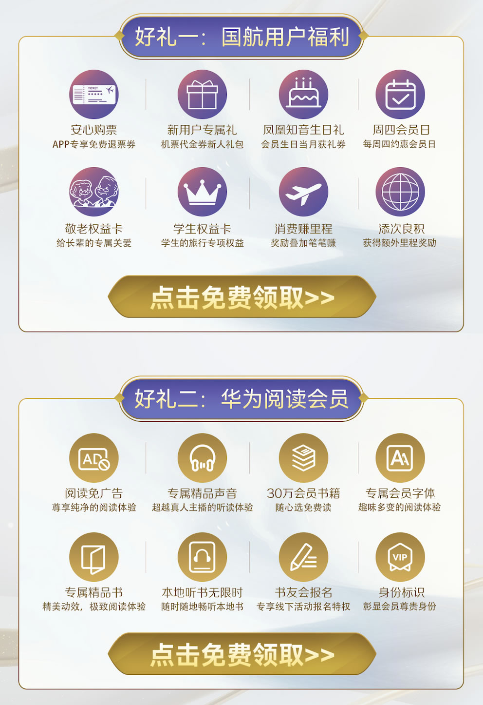 本次活動中,國航為用戶提供了退票券、生日禮、敬老權(quán)益卡、學(xué)生權(quán)益、新人專屬禮券等一系列大禮包。華為閱讀則為國航的用戶提供了30天閱讀會員的專屬福利!領(lǐng)取后可以享受超百家知名出版社30萬冊版權(quán)會員書籍免費(fèi)讀,不僅可以免費(fèi)使用專屬會員字體閱讀,還能獲得免廣告的純凈體驗(yàn)。同時,喜愛聽書的用戶還可以使用專屬的精品聲音聽書,本地聽書無限時,加入書架的書籍還內(nèi)置了專屬精品聲音,給用戶帶來超越真人主播的聽讀體驗(yàn)。華為閱讀還會定期組織線下書友會,領(lǐng)取會員后可專享書友會優(yōu)先報名特權(quán)!