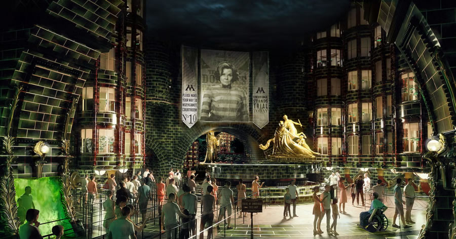 第二個(gè)矚目的新園區(qū)是哈利波特魔法世界(The Wizarding World of Harry Potter)的擴(kuò)建園區(qū):并命名為魔法部之謎(Ministry of Magic),項(xiàng)目首次跳出了一期園區(qū)霍格沃茨與對(duì)角巷,深入《神奇動(dòng)物》系列中1920年代的巴黎魔法部。喬治卡爾森(George Carlson)設(shè)計(jì),英國(guó)全息視覺(jué)公司Holovis打造的 “魔法部時(shí)空電梯(Ministry Time-Turner Elevator)”將無(wú)縫穿梭紐約、倫敦與巴黎,采用4D投影實(shí)時(shí)渲染窗外街景,形成極具震撼力的沉浸式魔法場(chǎng)景體驗(yàn)。而 “默默然防御訓(xùn)練(Obscurial Escape)” 多人射擊游戲,需用魔杖擊退熱感應(yīng)投影的黑暗生物,積分實(shí)時(shí)影響勛章等級(jí),將游客互動(dòng)參與性帶入全新的高度。