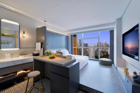 客房哲學(xué):320間客房搭配全景落地窗設(shè)計,干濕分離設(shè)計搭配臨窗浴缸,申寶冷暖床墊實現(xiàn)“冬暖夏涼”智能溫控,高端雅蘭布草,細(xì)節(jié)處彰顯東方待客之道。