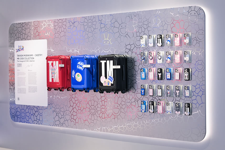 快閃空間特別設(shè)置 CASETiFY x 村上隆聯(lián)名系列展示墻,超限量發(fā)售 MR.DOB 主題聯(lián)名彈韌防摔21寸登機(jī)旅行箱,一起步入村上隆的奇妙世界。