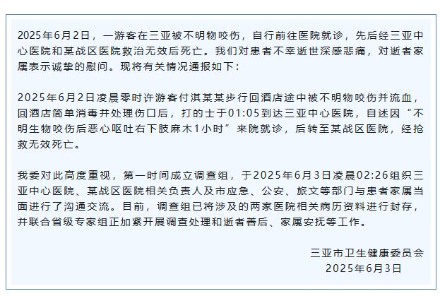據(jù)“三亞市衛(wèi)生健康委”微信公眾號(hào)消息,6月2日,一游客在三亞被不明物咬傷,自行前往醫(yī)院就診,先后經(jīng)三亞中心醫(yī)院和某戰(zhàn)區(qū)醫(yī)院救治無(wú)效后死亡。三亞市衛(wèi)生健康委將有關(guān)情況通報(bào)如下: