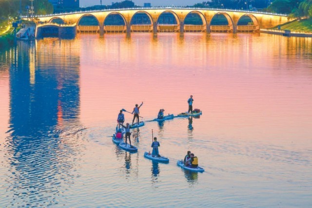 水聲、指導(dǎo)聲,夾雜著成功駕馭后的歡呼聲,交織成大運(yùn)河上獨(dú)特的活力樂章。微風(fēng)拂過,帶來水汽的清涼,也吹散了一些夏日燥熱。阿珂說,俱樂部正在推廣“城市微度假、微旅行”的理念,給年輕人打造一個(gè)不用出遠(yuǎn)門就有休閑度假感的娛樂解壓場景。“大運(yùn)河比城里的護(hù)城河、亮馬河寬闊得多,傍晚時(shí)分波光粼粼的感覺棒極了!濱水休閑步道以及各類配套服務(wù)設(shè)施也挺完善,真的很適合微度假。”他說,接下來希望能帶更多人在大運(yùn)河上體驗(yàn)槳板運(yùn)動(dòng)的快樂。