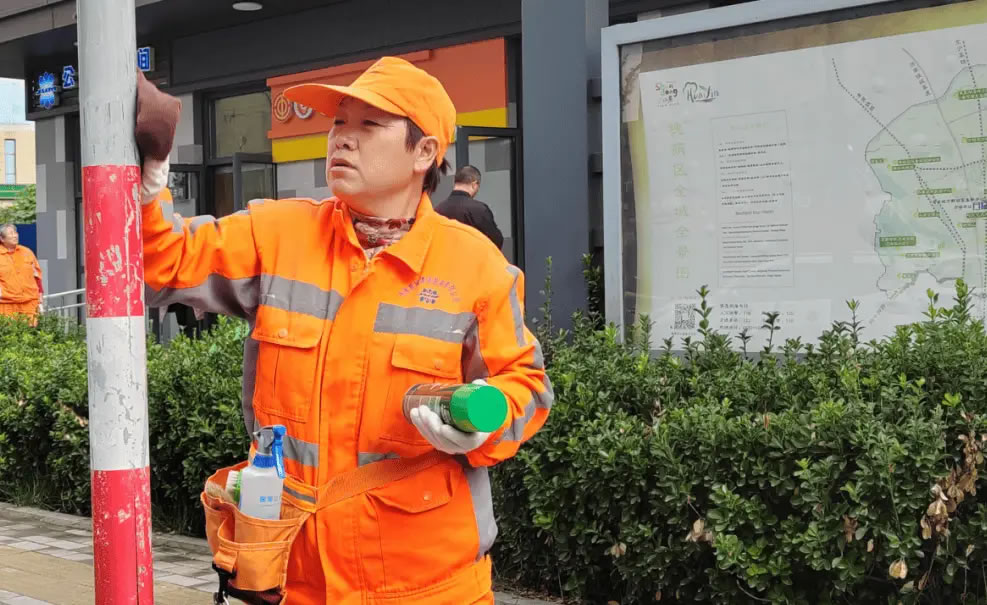 在槐蔭區(qū),環(huán)衛(wèi)工人馬增霞隨身攜帶“八寶袋”,對齊州路沿線的垃圾桶、路燈桿、公交站牌等進行清掃。“這個‘八寶袋’里有軟毛刷、硬毛刷、除膠劑、手套、噴壺等8種工具。”馬增霞介紹,“八寶袋”輕便易攜且取用便捷,可實現(xiàn)“一包在手,百污可除”,有效提升了主次干道人行道、交通出入口等重點區(qū)域的動態(tài)巡查處置效率;夾層內(nèi)的清涼油、創(chuàng)可貼、速效救心丸,既為保潔人員提供安全防護,也能滿足市民應(yīng)急需求。