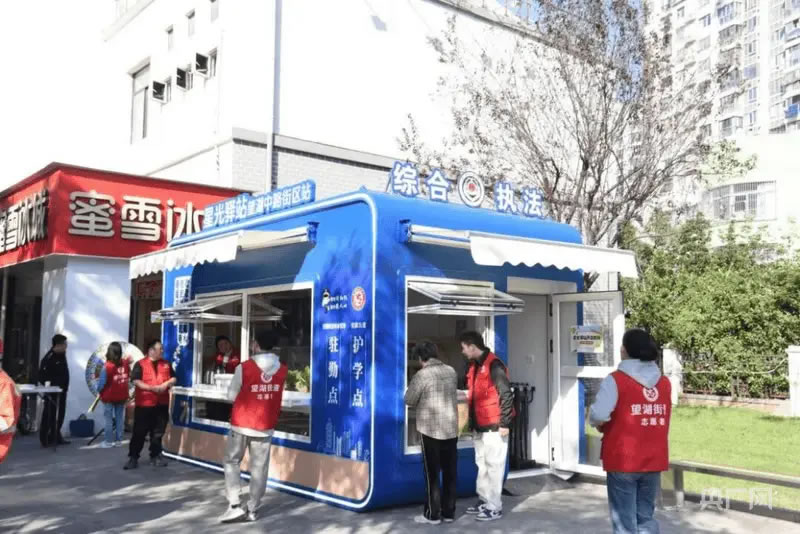 作為街區(qū)重要的“便民樞紐”,星光驛站功能定位清晰明確:面向戶(hù)外勞動(dòng)者,這里是一座“能量補(bǔ)給站”,免費(fèi)提供飲水、熱飯、充電等基礎(chǔ)服務(wù),驅(qū)散奔忙的疲憊;對(duì)于周邊居民,它是一處“暖心港灣”,常態(tài)化開(kāi)展義診、義剪等志愿服務(wù),讓便利直達(dá)身邊;針對(duì)沿街商戶(hù),驛站則是一個(gè)“助力平臺(tái)”,及時(shí)更新政策手冊(cè)、提供證照辦理咨詢(xún),助力經(jīng)營(yíng)發(fā)展。