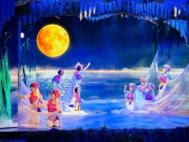 島上的龍宮溶洞是一處天然形成的水下溶洞,全長約1300米,可以說是全國僅存在水島上的溶洞。洞內(nèi)石柱、石筍、石幔等喀斯特地貌景觀發(fā)育完整。特別值得一提的是,洞內(nèi)設(shè)有水下劇場,每天上演反映白族漁家生活的歌舞表演,成為游客了解當(dāng)?shù)匚幕闹匾翱凇?/p>