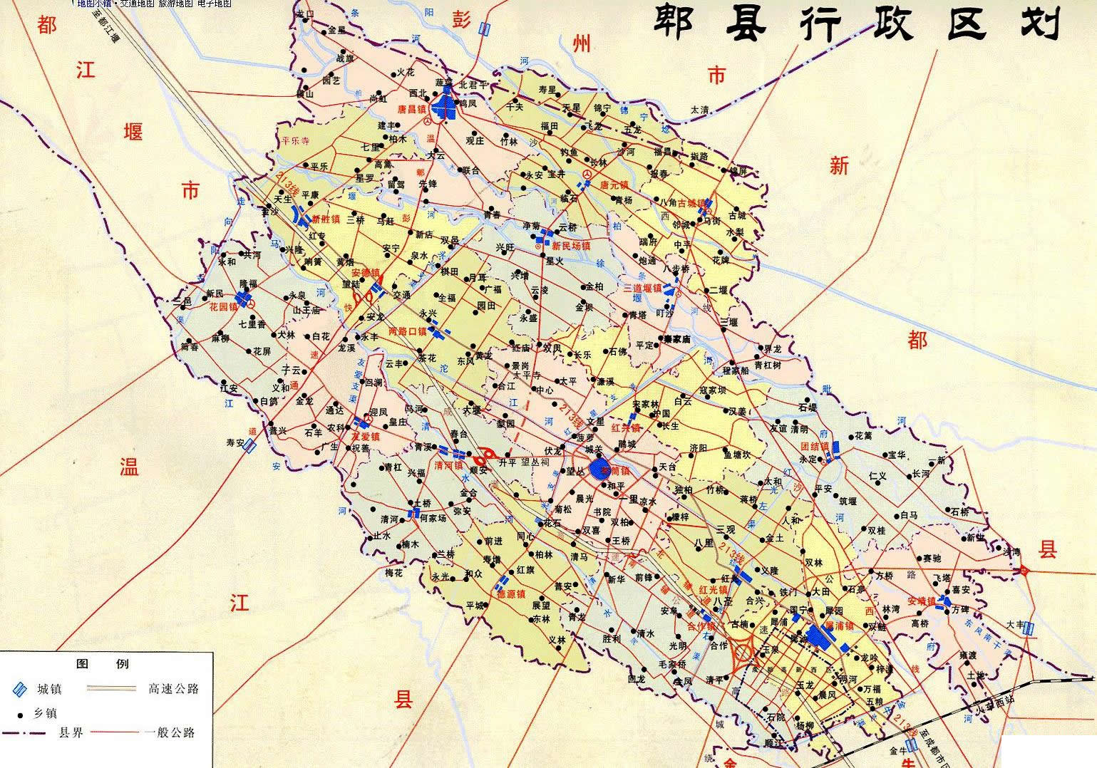 郫縣轄14個(gè)鎮(zhèn):郫筒鎮(zhèn)、犀浦鎮(zhèn)、紅光鎮(zhèn)、安靖鎮(zhèn)、團(tuán)結(jié)鎮(zhèn)、唐昌鎮(zhèn)、三道堰鎮(zhèn)、新民場(chǎng)鎮(zhèn)、花園鎮(zhèn)、安德鎮(zhèn)、唐元鎮(zhèn)、德源鎮(zhèn)、古城鎮(zhèn)、友愛(ài)鎮(zhèn)