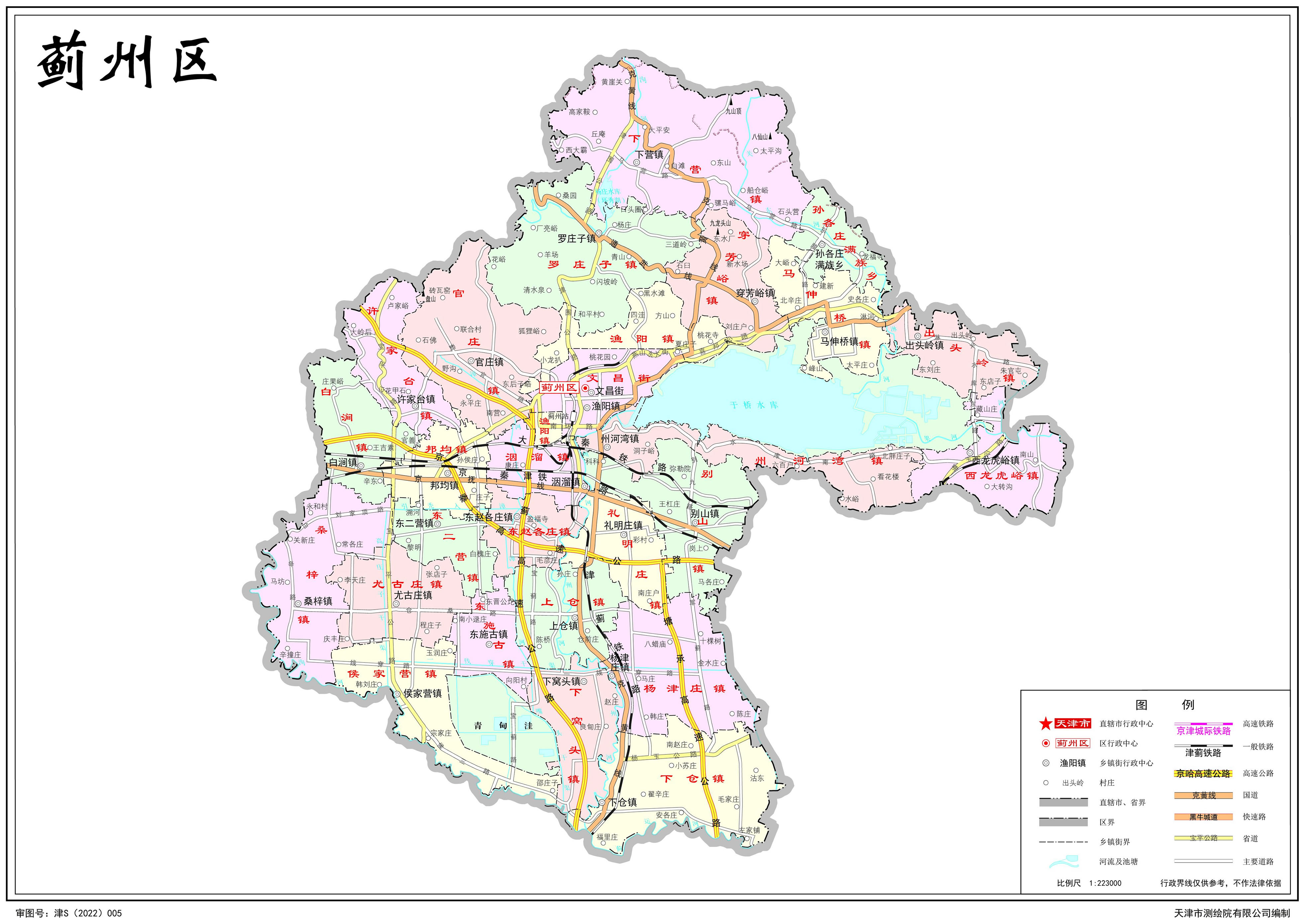 鎮(zhèn):漁陽鎮(zhèn)、洇溜鎮(zhèn)、官莊鎮(zhèn)、馬伸橋鎮(zhèn)、下營鎮(zhèn)、邦均鎮(zhèn)、別山鎮(zhèn)、尤古莊鎮(zhèn)、上倉鎮(zhèn)、下倉鎮(zhèn)、羅莊子鎮(zhèn)、白澗鎮(zhèn)、侯家營鎮(zhèn)、桑梓鎮(zhèn)、東施古鎮(zhèn)、下窩頭鎮(zhèn)、楊津莊鎮(zhèn)、出頭嶺鎮(zhèn)、西龍虎峪鎮(zhèn)、穿芳峪鎮(zhèn)、東二營鎮(zhèn)、許家臺鎮(zhèn)、禮明莊鎮(zhèn)、東趙各莊鎮(zhèn)、州河灣鎮(zhèn)