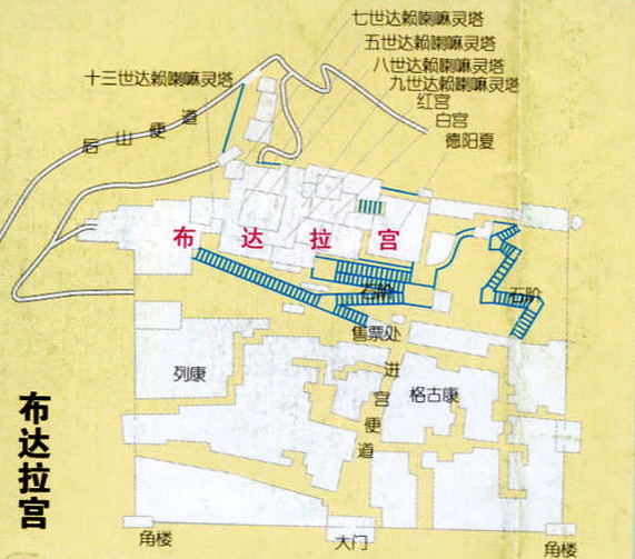 布達(dá)拉宮的基本面貌,主要是公元17世紀(jì)五世達(dá)賴?yán)飼r(shí)期重建的白宮及其圓寂后修建的紅宮,“此后歷代達(dá)賴又相繼擴(kuò)建,終成布達(dá)拉宮今日之規(guī)模!