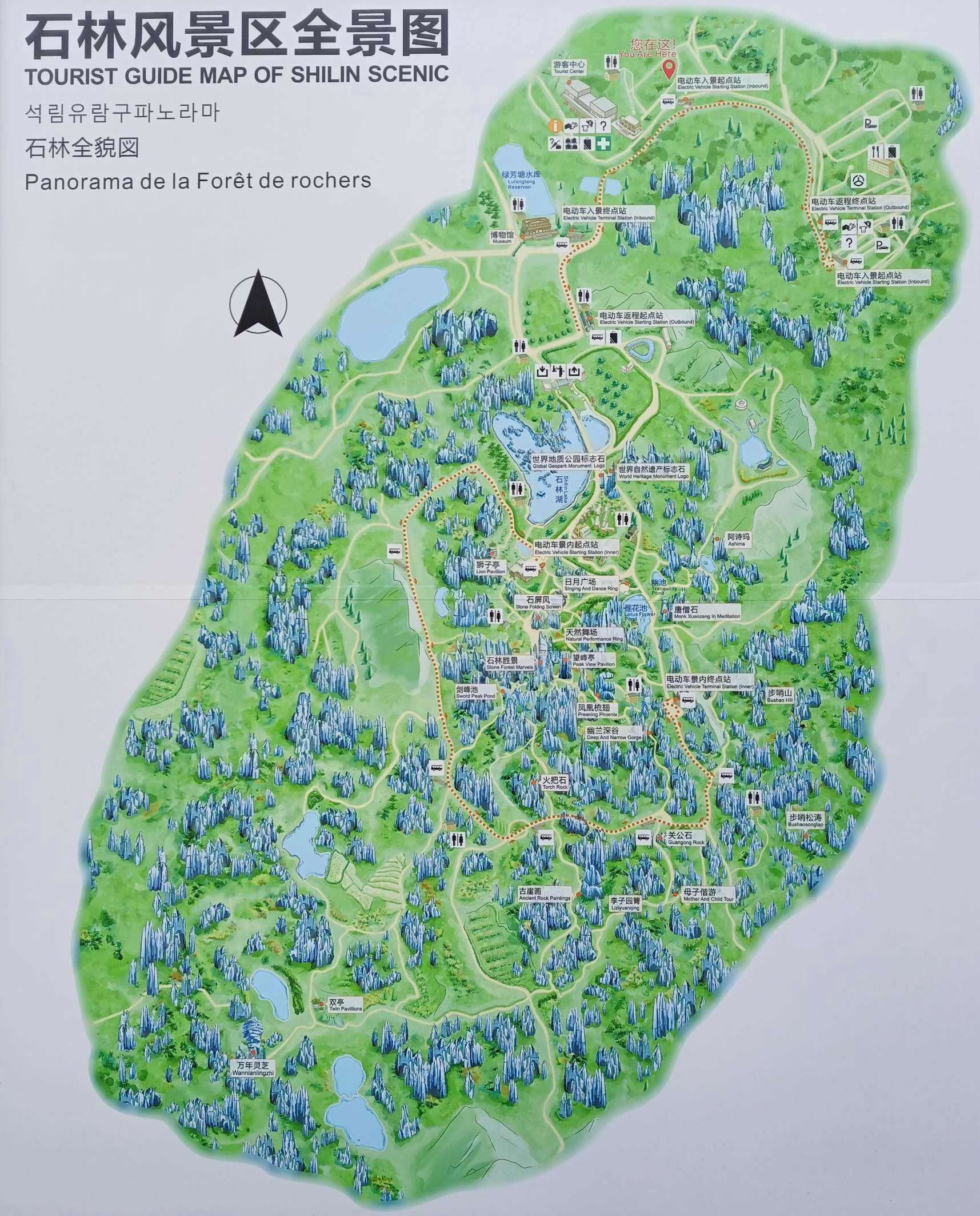 風(fēng)景區(qū)內(nèi)主要旅游景點:石林位于昆明市東,是世界罕風(fēng)的風(fēng)景名勝,是大自然鬼斧神工杰作。在路南廣達(dá)400平方公里的區(qū)域內(nèi),遍布著上百個黑色大森林一般的巨石群。有的獨(dú)立成景,有的縱橫交錯,連成一片,占地數(shù)十畝,上在畝不等。只見奇石拔地而起,參差崢嶸,千姿百態(tài),巧奪天工,被人們譽(yù)為“天下第一奇觀”。石林的主要游覽區(qū)李子箐石林,面積約12平方公里,游覽面積約1200畝。主要由石林湖、大石林、小石林和李子園幾個部分組成,游路5000多米,是石林景區(qū)內(nèi)單體最大,也是最集中、最美的一處。每年農(nóng)歷六月二十四日的火把節(jié),石林四周的彝、漢等各族群眾都要從四面八方匯集到石林歡慶佳節(jié)。人們在白天舉行摔跤、爬桿、斗牛等比賽活動,夜晚則燃起熊熊篝火,耍龍、舞獅、表演民族歌舞。阿細(xì)跳月、大三弦舞則是最受歡迎的傳統(tǒng)節(jié)日。