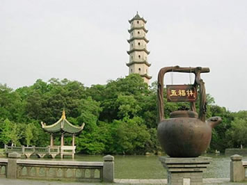 西塔始建于北宋開寶二年(969年),一說建于唐咸通十年(869年),明、清曾多次修繕。塔高32米,底徑7米,6邊形,7層,中空,系樓閣式青磚仿木構(gòu)建筑。遠(yuǎn)遠(yuǎn)望去,碧水藍(lán)天,全身披綠的西峰山托著磚紅色寶塔,塔剎直入云端,蔚為壯觀。就近處,江風(fēng)吹動四十二個(gè)檐角的銅風(fēng)鈴送聲,四周枝頭飛禽清脆的啼嗚,交響成趣。塔每層每面均有小佛龕,內(nèi)置石雕佛像,造型精致,神態(tài)自然,有頗高的藝術(shù)價(jià)值,塔周圍置青石坐凳,萬木扶疏。因塔身傾斜,曾于1982年進(jìn)行大修葺。今塔仍保持宋代風(fēng)格。
